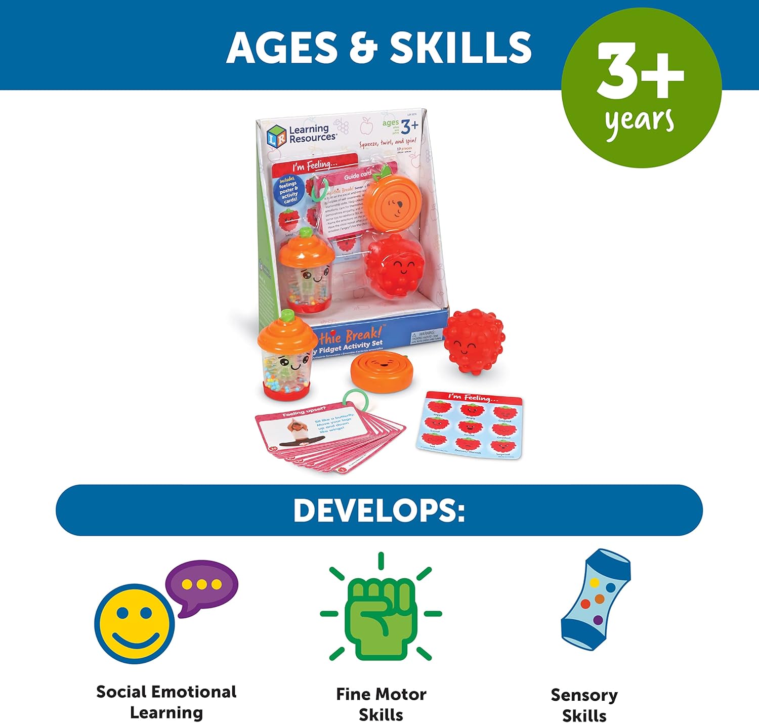 Treat yourself to a sensory smoothie with these friendly sensory fidget toys! Kids discover sweet ways to reset and build social-emotional learning (SEL) skills when they play with the Smoothie Break! Sensory Fidget Activity Set from Learning Resources. This set of three smoothie fidget friends comes with all kinds of fidget fun—kids can twirl and swirl the boba balls, squeeze the textured strawberry, and spin the orange spinner! There’s more than just fidget fun here, though—the Smoothie Break! Sensory Fidget Activity Set also comes with guided calming activities that help kids get centered, as well as an illustrated emotions poster that helps them identify and talk about what they’re feeling. This set of preschool sensory toys is ready for fidget fun at home or on the go play, as well as use in classroom calm down corners or school counselor supplies, or even as a therapy game for kids! From sensory bin essentials to fun ways to fidget, award-winning educational toys from Learning Resources engage kids’ hands, brains, and senses through screen-free, hands-on play. Designed to help lower stress, provide calm after challenges, and regulate emotions, these sensory toys give kids the tools they need to be the best versions of themselves. Made from durable, BPA-free plastic, our sensory toys are ready for years of learning fun at home or in the classroom. We’re Learning Resources, and learning is where we play. With nearly 40 years of experience, our family-owned company’s mission is founded on offering kids educational toys for infinite inspiration to succeed in school and beyond. From ABCs and 123s to fine motor and STEM, our award-winning educational toys help kids discover countless ways to develop a lifelong love of learning while they build new skills. In 2022, Learning Resources expanded this dedication to learning and enrichment with Brightkins, a line of interactive pet training tools and toys that help families discover bright ways for pets to play! Learn more about how we turn a childhood love of play into a lifelong love of learning with a visit to our brand store today.