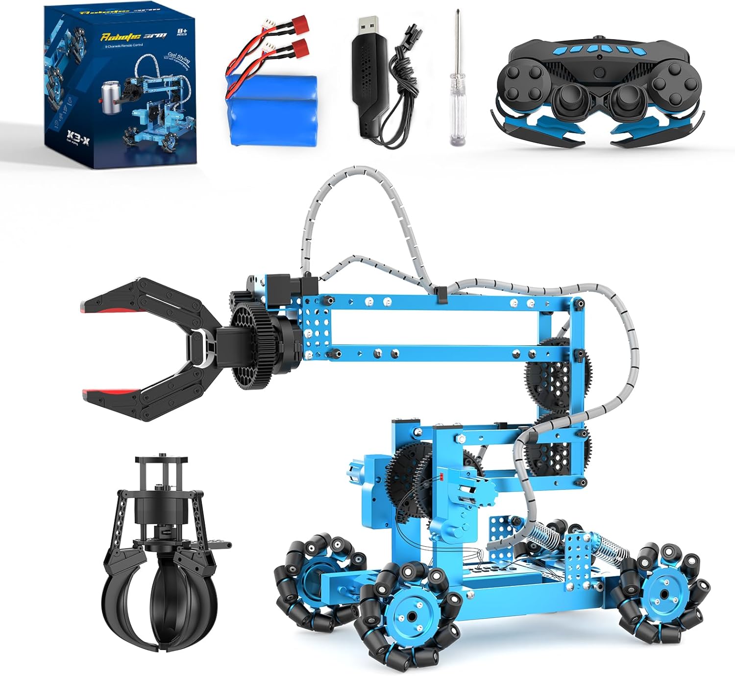 📦PRODUCTS INCLUDE: 1 x robot arm toy, 1 x 2.4Ghz remote control, 2 x 1800mAh 7.4v rechargeable lithium batteries, 1 x USB charging cable, 1 x toolkit and extra gift.